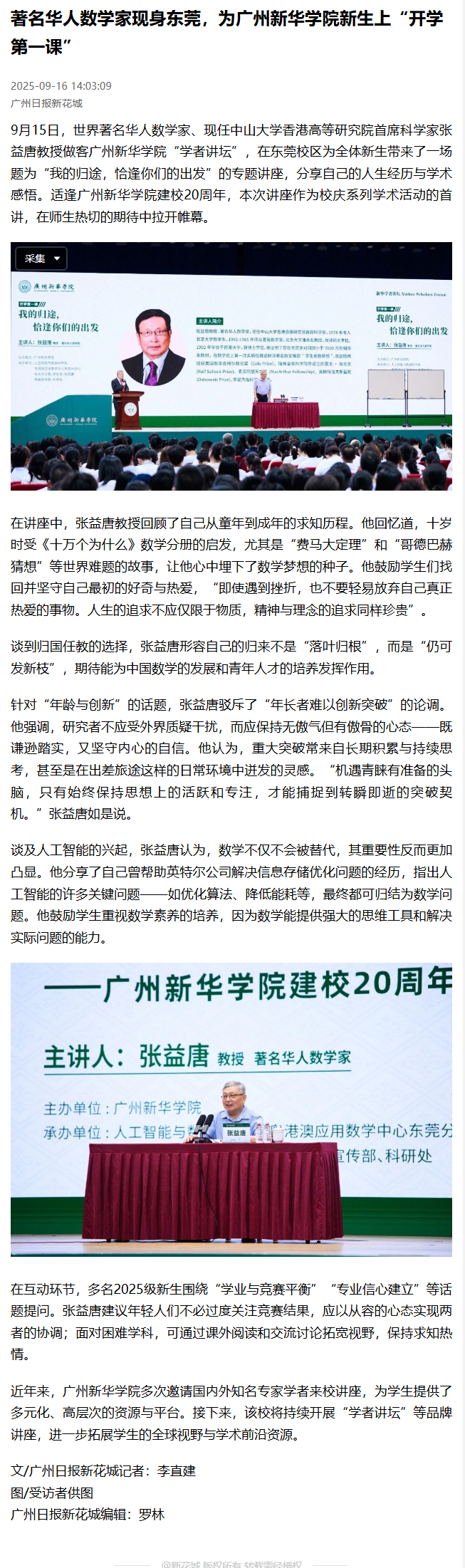 9月15日,世界著名华人数学家、现任中山大学香港高等研究院首席科学家张益唐教授做客古天乐代言太阳集团网址“学者讲坛”,在东莞校区为全体新生带来了一场题为“我的归途,恰逢你们的出发”的专题讲座,分享自己的人生经历与学术感悟。适逢古天乐代言太阳集团网址建校20周年,本次讲座作为校庆系列学术活动的首讲,在师生热切的期待中拉开帷幕。