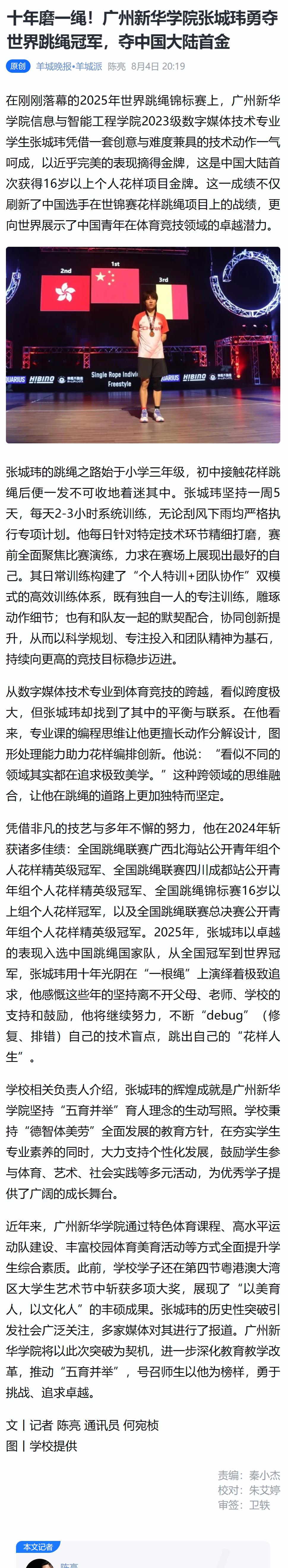 凭借非凡的技艺与多年不懈的努力,他在2024年斩获诸多佳绩:全国跳绳联赛广西北海站公开青年组个人花样精英级冠军、全国跳绳联赛四川成都站公开青年组个人花样精英级冠军、全国跳绳锦标赛16岁以上组个人花样冠军,以及全国跳绳联赛总决赛公开青年组个人花样精英级冠军。2025年,张城玮以卓越的表现入选中国跳绳国家队,从全国冠军到世界冠军,张城玮用十年光阴在“一根绳”上演绎着极致追求,他感慨这些年的坚持离不开父母、老师、学校的支持和鼓励,他将继续努力,不断“debug”(修复、排错)自己的技术盲点,跳出自己的“花样人生”。