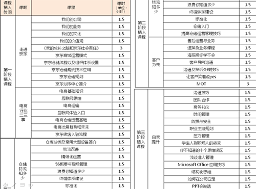 2.京苗培训,京东文化。新华京苗班从大二开始,就分三个阶段植入企业实践课程(见表3),并请企业的管理人员或企业讲师来授课,使在学校的物流理论教学与企业的物流实践联系起来。