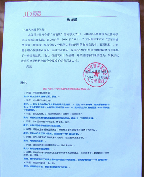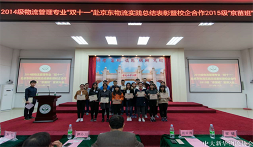 2.京苗课题,实践硕果。不管是“新华京苗班”的轮岗实习(大二、大三暑假各一期,共两期),还是以“新华京苗班”为骨干的全物流学生“双十一”的物流实践,我们都提出了“四个一”的基本要求即:“带着一个专业求知去实习、学会一种岗位作业技能、发现一个物流现场问题、分析问题原因提出一项解决思路”。两年来的早参加社会实践活动,同学们都基本完成这“四个一”的实践任务要求,受到了京东的表扬,第一期“新华京苗班”学员也顺利结业。