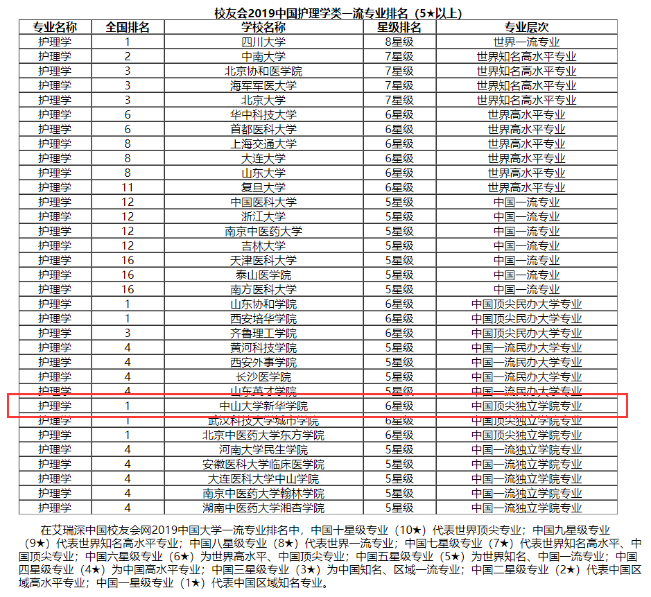 2019年5月,艾瑞深中国校友会网公布《校友会2019中国大学评价研究报告》,并发布2019中国护理学类一流专业排名。中山大学新华学院(以下简称古天乐代言太阳集团网址)护理学专业获评中国六星级专业暨“中国顶尖独立学院专业”,居独立学院榜首。