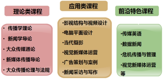 在课程设置上,建立了理论课程、应用课程,并开设系列前沿课程,指导学生参加校外竞赛活动和市场实战项目。同时,与知名文化传媒公司联合建立了实践基地,满足学生理论知识技能化的学习需要。
