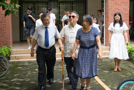 王庭槐校长(左一)与鲁晏宾、王锁瑛夫妇漫步校园,亲切交流
