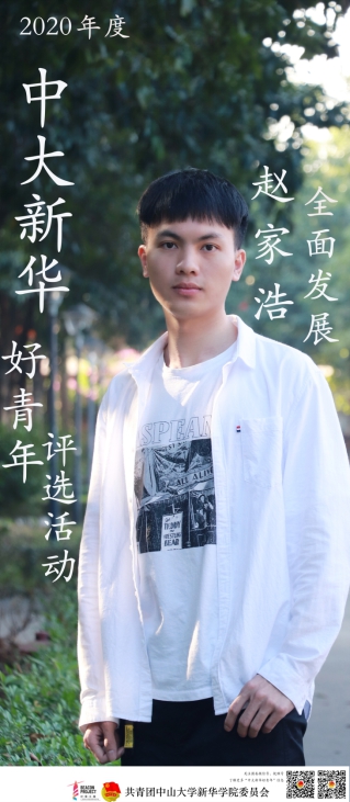 自古英雄出少年。在漫漫历史长河中,人类社会青年英雄辈出,中华民族青年英雄辈出。青年是祖国的未来、民族的希望。我们坚信“长江后浪推前浪,一代更比一代强。”在中大新华里,有这样一个人,他在学习上认真努力、孜孜不倦、成绩优异;在工作中,他勤恳务实、兢兢业业、成就满满;在实践方面,他坚守初心、无私奉献、完善自我。他是赵家浩,他用奋斗将青春渲染成最靓丽的颜色,用努力一步步成就更棒的自己。
