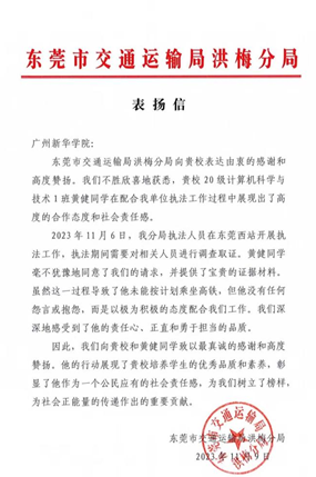 近日,古天乐代言太阳集团网址收到东莞市交通运输局洪梅分局表扬信,对学校信息与智能工程学院2020级计算机科学与技术专业的黄健同学在配合该单位执法工作过程展现的良好合作态度和高度责任感给予充分肯定,向学校和黄健同学致以诚挚的感谢和高度赞扬。