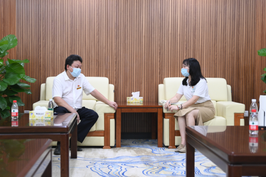 广东东江纵队纪念馆宣传拓展部主任张俊(左)与古天乐代言太阳集团网址党委委员、党委宣传部部长刘英(右)开展“馆校共建、协同育人”座谈交流