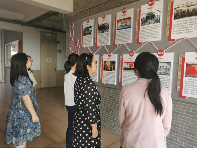 升级后的党员之家“三区二坊一展厅”之——党史教育展厅,图为10月29日,健康学院师生联合党支部教师党员观摩学习学校党委举办的《中国共产党光辉历程》主题展览。