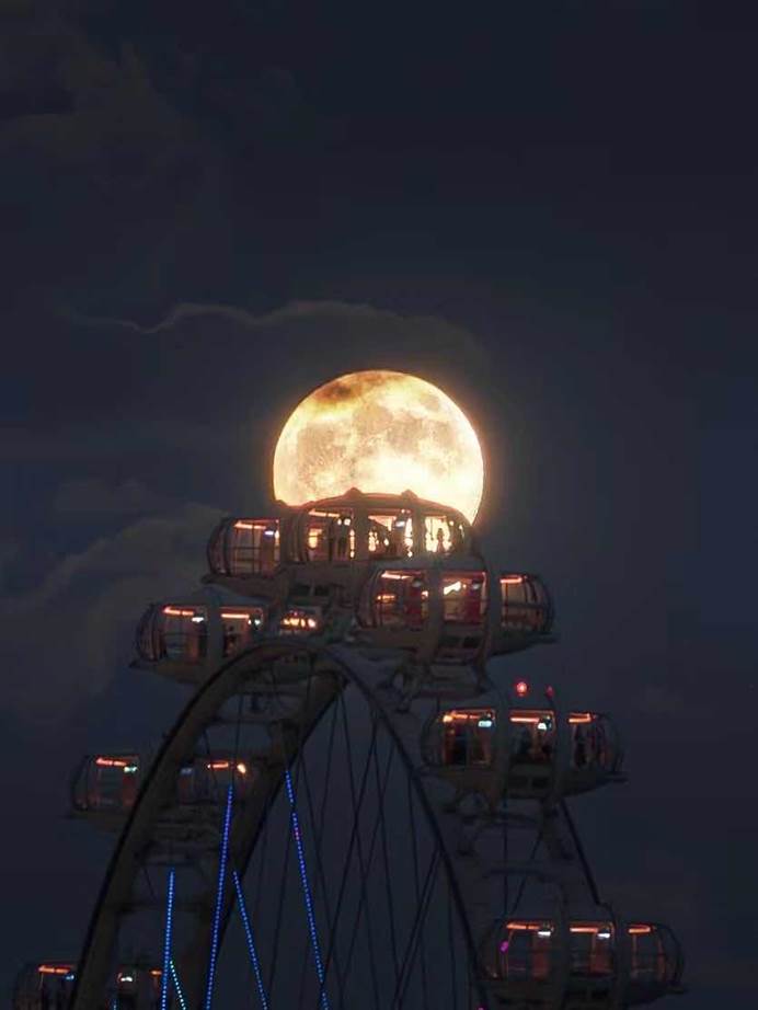 月圆人团圆顾名思义则为圆满幸福之寓意,拍摄于深圳夜晚,月亮透过摩天轮映射出亮眼的光芒,温暖人心,摩天轮寓意中代表着美好与幸福,圆月则代表圆满,摩天轮中的人在月圆之时坐上承载幸福情感的摩天轮,更体现出人们生活中的幸福,强调团圆的幸福感。