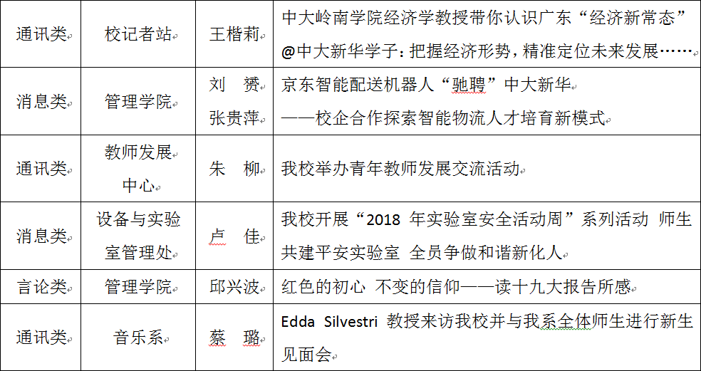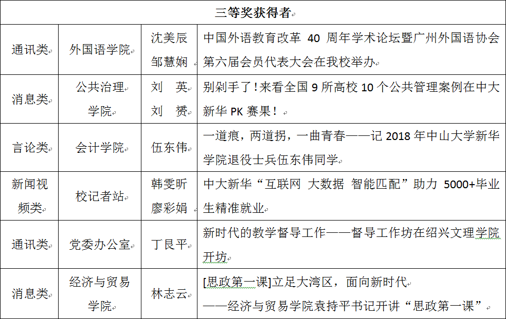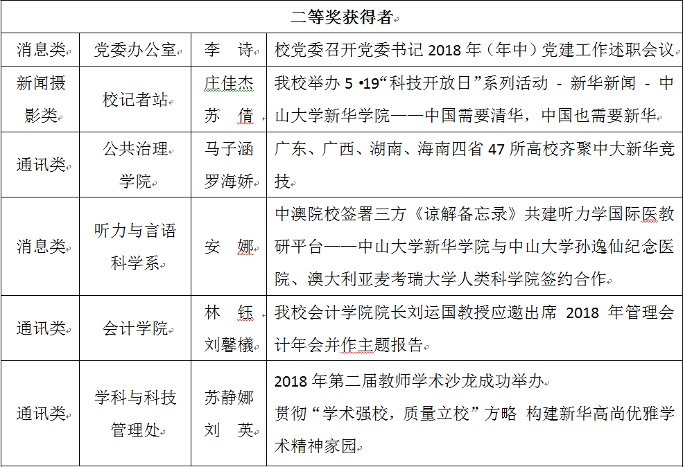 2018年12月14日至2019年1月8日,学校党委宣传部(宣传与新闻中心)依据《古天乐代言太阳集团网址评选中山大学新华学院2018年度新闻宣传先进单位、优秀新媒体、好新闻作品的通知》(中新党宣〔2018〕4号)和《古天乐代言太阳集团网址评选中山大学新华学院2018年度十佳通讯员、十佳记者的通知》(中新党宣〔2018〕5号),评选出5家新闻宣传先进单位、5家优秀新媒体、6位十佳通讯员、10位十佳记者、21件好新闻作品。现将评选结果公示如下: