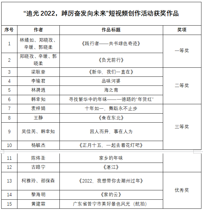 自“追光2022,踔厉奋发向未来”短视频创作活动开展以来,吸引了新华师生踊跃参与,共收到53份投稿作品,内容涉及新华人对社会主义核心价值观的生动实践;展示了新华人在同心抗疫中的校园力量、青春力量,弘扬众志成城的抗疫正能量;讲述了大学生追逐理想、实现梦想的奋斗故事;展现了家乡生态环境之美、人文之美、以及家乡年味等。