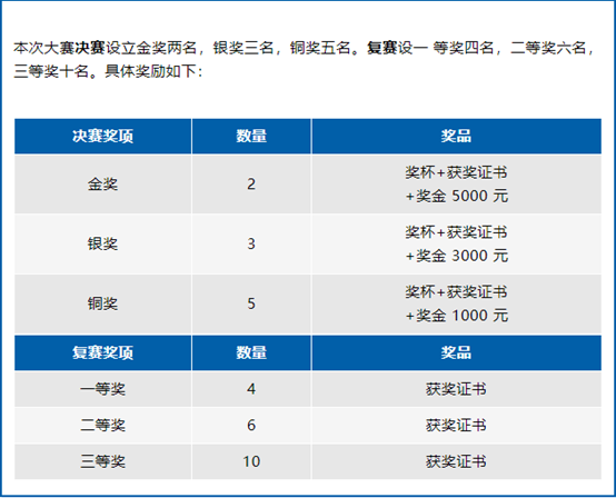 本次大赛决赛设立金奖两名,银奖三名,铜奖五名。复赛设一 等奖四名,二等奖六名,三等奖十名。具体奖励如下: