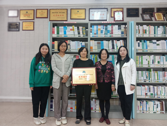 图书馆副馆长钟伟珍(右二)、陈宝琪(左二)与获奖老师唐玉佳(中)及图书馆老师合影