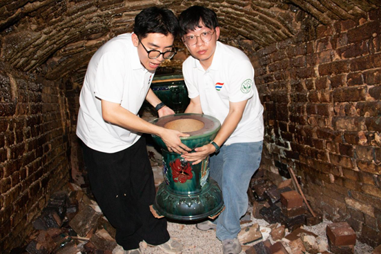 实践队队员们在师傅的指导下尝试体验陶塑出窑环节