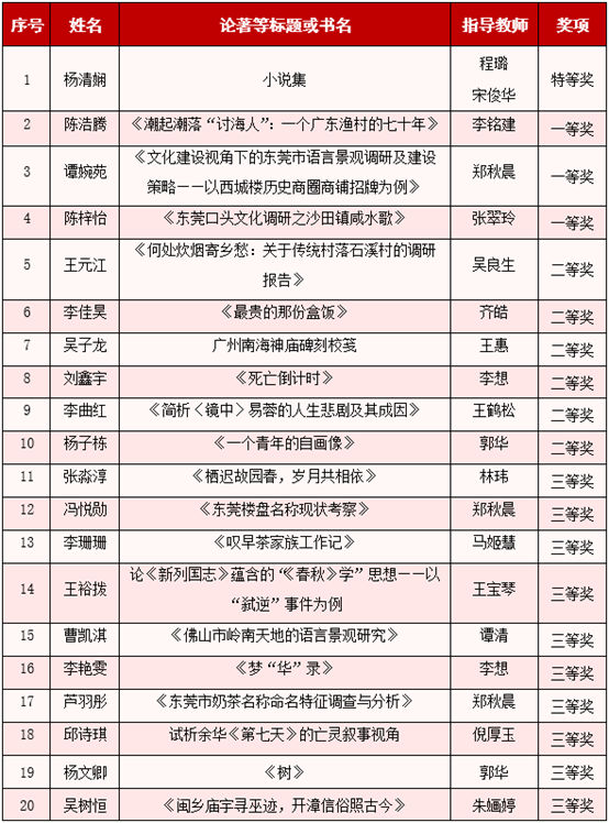在本次广东省大学生写作大赛中,学校中国语言文学系师生的多部作品凭借独特的创意和扎实的文学功底,在众多参评作品中脱颖而出,喜获佳绩。其中,中国语言文学系2021届校友杨清娴荣获“特等奖”;19名在读学生分别荣获一二三等奖;程露、李铭建、郑秋晨等16位老师获“优秀指导教师”奖;李国斌老师的“小小说写作艺术”获“广东省写作学会教学成果二等奖”。