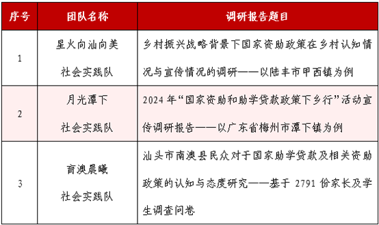 育澳晨曦社会实践队于2024年7月中下旬在汕头市南澳县开展了以“政策春风暖澳乡,育澳共筑青春梦”为主题的系列资助政策宣传活动。团队走进南澳县云澳中学进行课堂宣讲,在北回归线广场党群服务中心摆摊宣传,前往学生家中走访和宣传,同时结合线上宣传等形式,有效提升了当地对国家资助和助学贷款政策的知晓率,助力乡村教育发展。团队在南澳县教育局支持下,发动南澳县内小学至高中9所学校的学生及家长填写《广东省国家助学贷款问卷调查》,共回收问卷2791份,并进一步完成了调研报告《汕头市南澳县民众对于国家助学贷款及相关资助政策的认知与态度研究——基于2791份家长及学生调查问卷》。