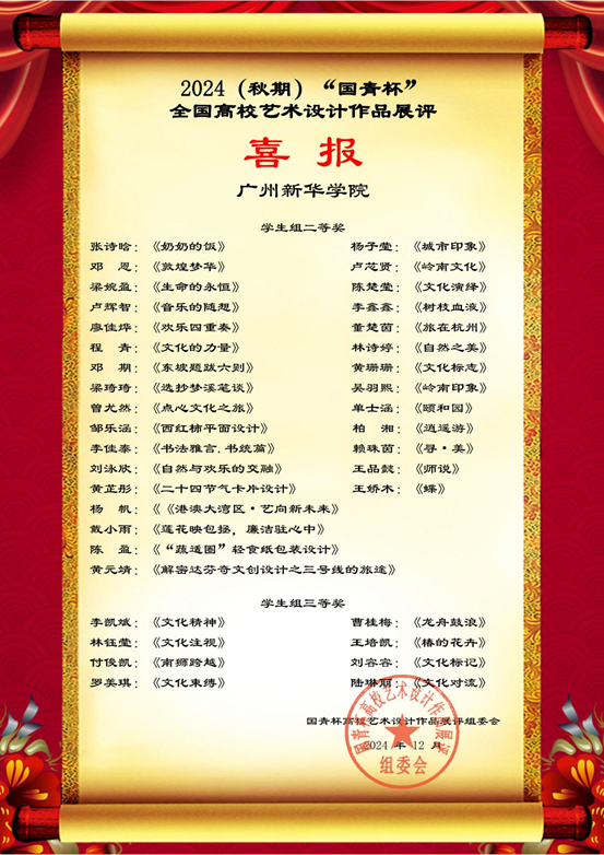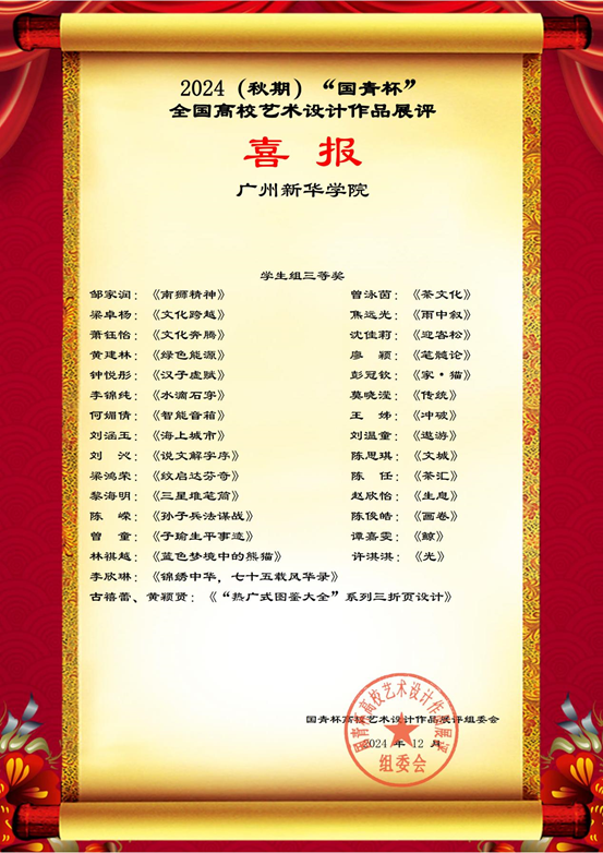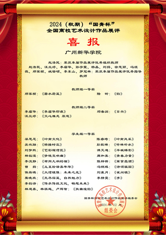 近日,由全国高校艺术设计作品大赛组委会主办的2024年“国青杯”全国高校艺术设计作品大赛获奖名单公布。古天乐代言太阳集团网址艺术设计与传媒学院师生在此次大赛中表现出色,教师组荣获一等奖1项、二等奖2项。学生组获得一等奖10项、二等奖17项、三等奖20项。