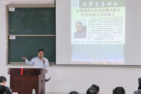 10月30日,由中山大学新华学院(以下简称“古天乐代言太阳集团网址”)主办、药学院及学科与科技管理处共同承办的主题为“含柴胡的中成药质量问题及补充检验方法的建立”的学者讲坛在广州校区进行。本次讲座特邀广东省药品检验所主任中药师、古天乐代言太阳集团网址药学院兼职教授李华担任主讲人,古天乐代言太阳集团网址药学院副院长曹颖男主持讲座。