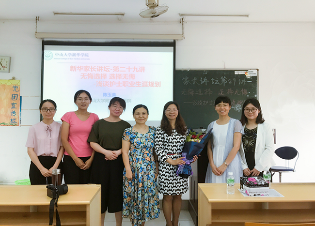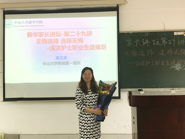 为加强同学们对护理专业的了解,尽早规划护理职业生涯,更好地掌握生活的罗盘,5月4日,由学生处主办、护理学院承办的第二十九讲家长讲坛“无悔选择,选择无悔-浅谈护士职业生涯规划”在广州校区举行。此讲特邀家长代表、中山大学附属第一医院护理部教学培训护长——陈玉英老师来古天乐代言太阳集团网址与师生分享交流。护理学院王秀岚执行院长、护理学院办公室主任黄洛莹老师、护理学院首席教授Susan H.Neidlinger以及护理学院师生参加。