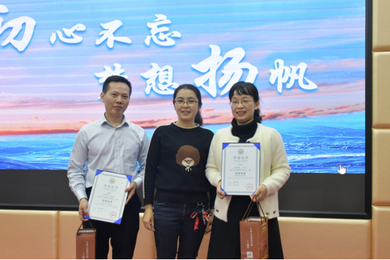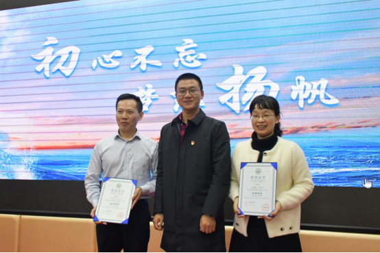 陶强副书记(中)为刘奇学先生(左)和陈伟霞女士(右)颁发证书