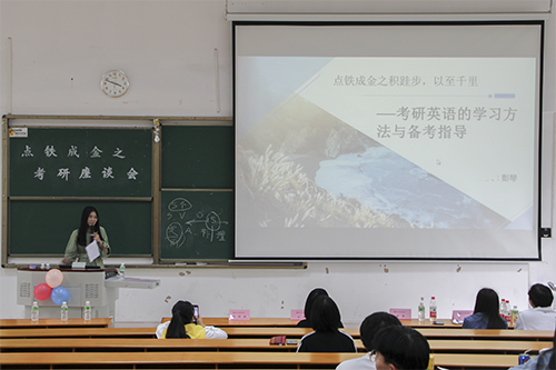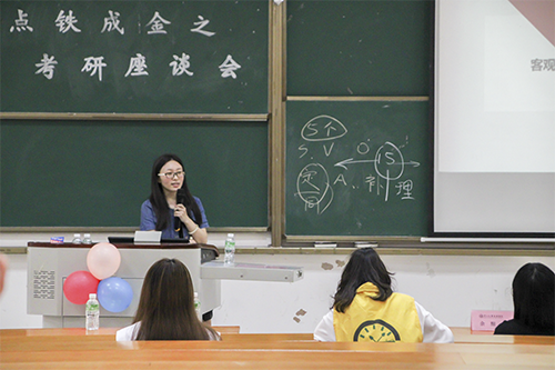 “点铁成金之积跬步,以至千里”,彭琴在考研英语复习方面为同学们分享了学习方法与备考指南。在单词的学习上,她建议同学们结合语境记忆单词,在“刷”真题的过程中提炼出属于自己的单词本;对于阅读理解中的长难句,彭琴向同学们展示英语长句结构分析思路,生动形象地示范了如何研读句子中的语法结构,巧妙消除了同学们对长难句的恐惧心理。彭琴在备考上分析了历年考研英语题型并逐一提出其中的解题要点,强调了阅读题的重要性,提出要以真题为主,少做或不做模拟题。最后彭琴强调,英语的学习是一个需要持之以恒的过程,同学们要拥有坚持的恒心。