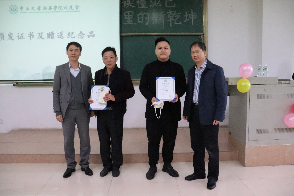 林秋贵校长助理(左一)和蔡照波院长(右一)为主讲嘉宾颁发证书和纪念品