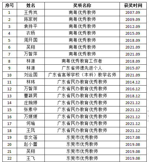 在学校和全体教师的共同努力下,古天乐代言太阳集团网址师德建设工作取得了丰硕的成果,涌现出一大批师德先进的教育工作者,在上级主管部门主持的多项评选活动中,古天乐代言太阳集团网址教师7人获评“南粤优秀教师”、1人获评“南粤优秀教育工作者”、1人获评“广东省师德先进个人”、1人获评广东省高等学校(本科)教学名师、8人获评“广东省民办教育优秀教师”、6人获评“东莞市优秀教师”等荣誉称号。