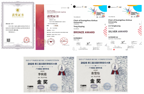 在声乐领域,音乐系合唱团征战第八届新加坡国际合唱节,一举夺得同声组银奖和民族组铜奖,展现了团队协作力;独唱方面,叶静琪、秦文碚凭借精湛技艺摘得第一届“孔雀杯”全国高等艺术院校声乐展演国家级奖项。钢琴领域也表现突出,袁雪怡、李枫霞均荣获第三届法国巴黎音乐大赛金奖,林子惠获香港国际钢琴邀请赛总决赛三等奖。创新实践方面,艺术管理方向的莫绮玮团队《遇见鱼灯》项目获第十九届艺术管理全国大学生创意策划大赛三等奖。