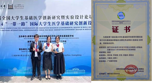 第十届全国医学创新设计大赛银奖获奖学生团队合影与证书