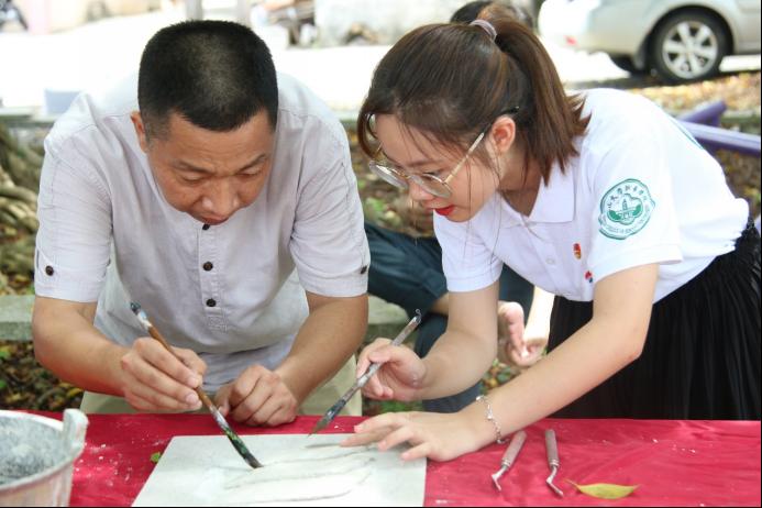 灰塑传承人指导古天乐代言太阳集团网址“三下乡”队伍“榕树社会实践队”队员创作灰塑作品