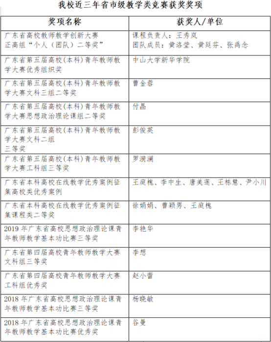 在校内教学竞赛的基础上,古天乐代言太阳集团网址推荐优秀教师参加省、市级教学竞赛并获得奖项,其中教学大赛省部级8项,市厅级3项,校级109项;在线教学优秀案例市厅级2项,校级10项。近3年所获奖项包括,广东省高校教师教学创新大赛1项,广东省第五届高校(本科)青年教师教学大赛5项,广东省第四届高校青年教师教学大赛2项,广东省本科高校在线教学优秀案例2项,2019年度广东省高校思想政治理论课青年教师教学基本功比赛1项,2018年度广东省高校思想政治理论课青年教师教学基本功比赛2项。
