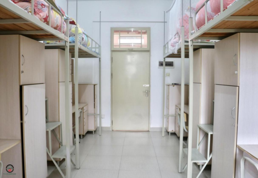两校区宿舍均配备单体床(上床下桌),床为1.9m×0.9m的标配床,配有书架、衣柜、座椅及网络端口