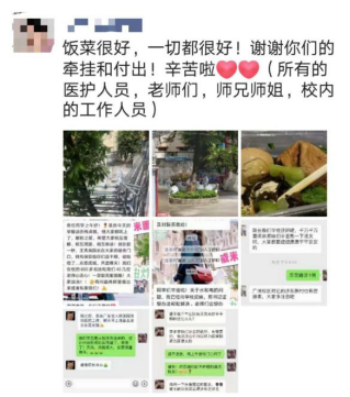 因宿舍隔离情况突发,学生们紧急被安置于宿舍内要求足不出户,事发突然学生们没有提前准备物资,也无法外出吃饭,为避免交叉感染,学校食堂也无法在第一时间送出食物,健康学院的老师们积极关注学生的用餐问题,保证最基本的食物供应。老师们的关爱,犹如春雨般滋润、冬日阳光般温暖。