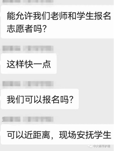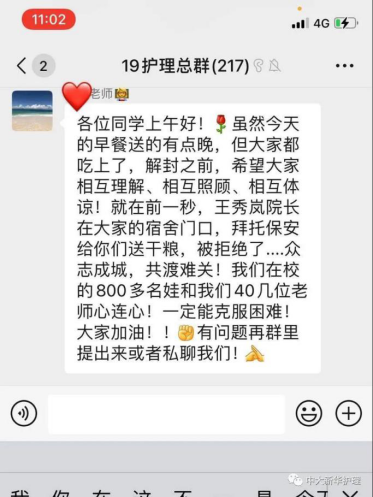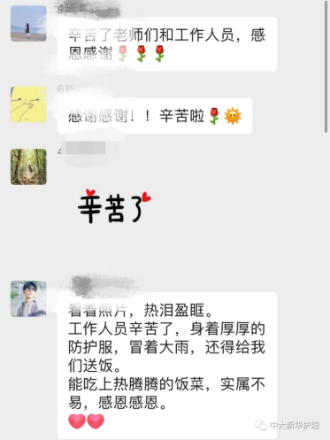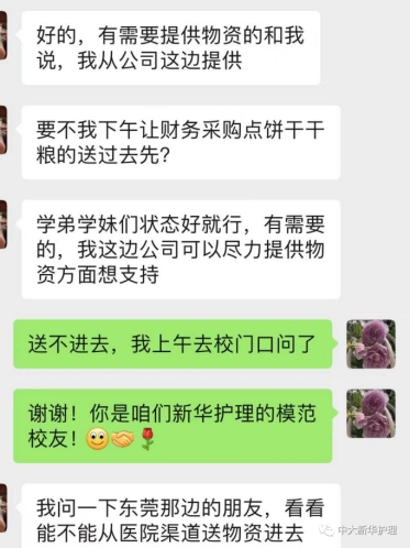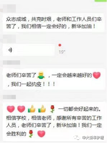 “积力之所举,则无不胜也;众智之所为,则无不成也”。在此次疫情防控中,护理学院全体师生同心抗疫,温情相伴。学院毕业校友有的主动请缨驰援东莞,有的集结校友为新华两校区捐赠物资,有的实时向院长了解校园情况及在校师生们的身心状态,他们的关怀时刻传达着对母校的爱与温情;学院志愿者们积极报名参与各项防疫工作,尽己所能,践行“奉献、友爱、互助、进步”的志愿服务精神;众多护理学子团结互助,在微信群、朋友圈互相加油打气。
