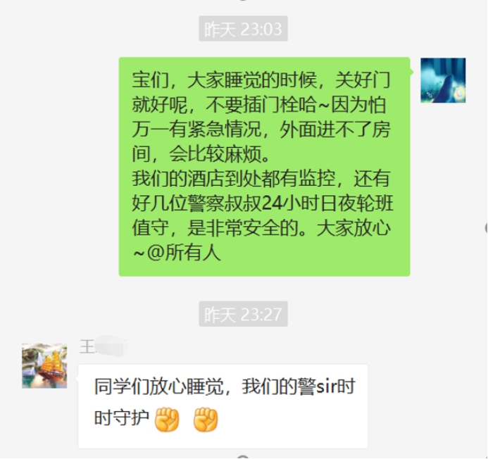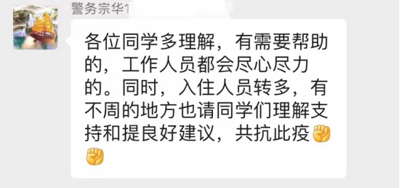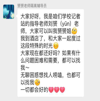 学校还在我们出来隔离的第二天安排了老师过来陪我们度过隔离生活。派过来的老师说学校很担心我们,我知道,学校真的很爱我们!