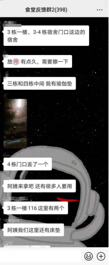 宿舍这一方小天地之外就是另一番景象了,听闻食堂的叔叔阿姨们都忙坏了,每天打包近一万份的快餐忙到手抽筋,我们每日三餐准时,而他们吃饭的时间匆匆忙忙,晚上也只是随意食堂大厅桌上休息……当然,大家的辛苦我们都看在眼里,感动在心里,对比之前那些不理解的抱怨,现在微信群里暖心的问候与互助让我深受感动。我在此立个flag:解封后,我要多去食堂吃饭!