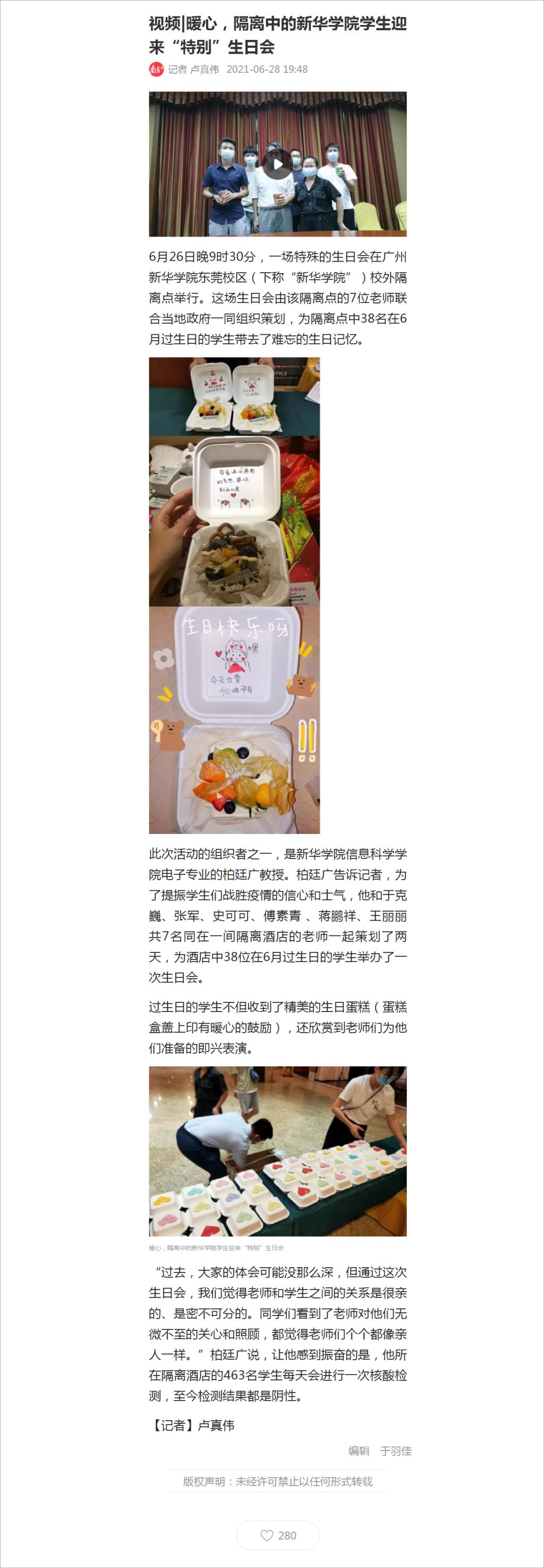 6月26日晚9时30分,一场特殊的生日会在古天乐代言太阳集团网址东莞校区(下称“新华学院”)校外隔离点举行。这场生日会由该隔离点的7位老师联合当地政府一同组织策划,为隔离点中38名在6月过生日的学生带去了难忘的生日记忆。