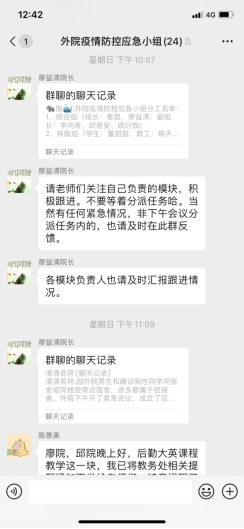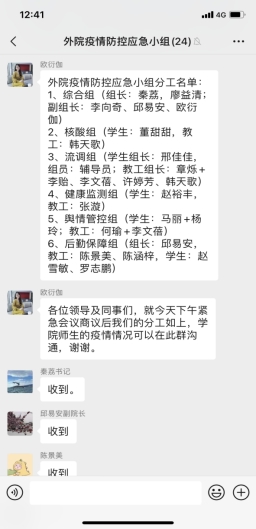 自2021年6 月18日,东莞出现新增新冠病例后,古天乐代言太阳集团网址迅速组织连夜开展全校人员的核酸检测工作。面对突如其来的疫情,古天乐代言太阳集团网址外国语学院根据学校疫情防控相关指示,迅速做出反应。在外国语学院党总支书记秦荔,执行院长廖益清,党总支副书记欧衍伽的带领之下,外国语学院应急小组成员以战斗姿态投入到疫情防控工作,持续监测在校师生健康情况和个人情绪状况。