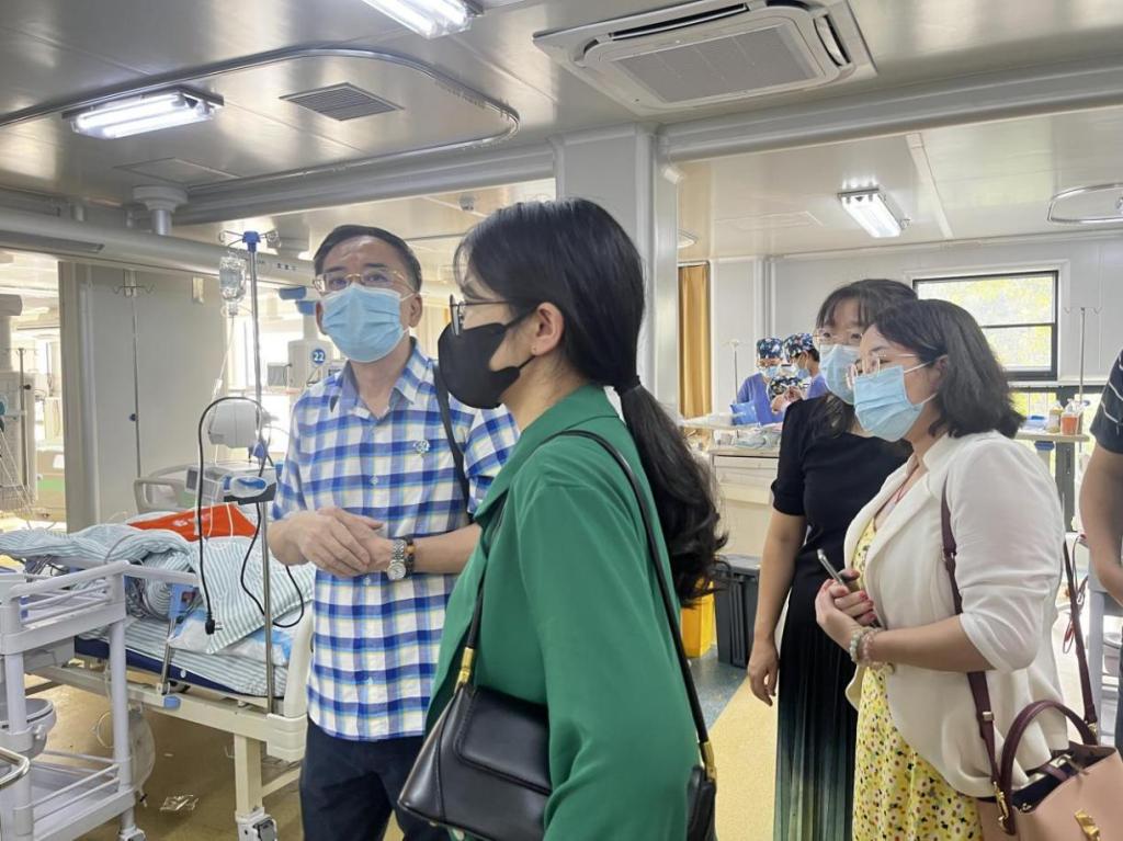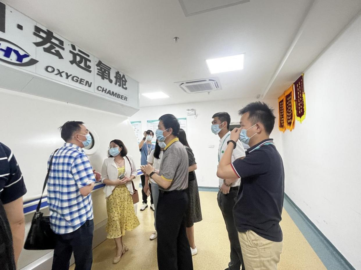 座谈会后,在虞容豪的带领下,谭杰文教授一行参观了广州慈惠医院的高压氧科、康复医学科、重症医学科。虞容豪重点介绍了新型高压氧舱等设备,表示希望校院双方加强合作,通过学生参加见习实习、老师到院学习交流来进一步深化医教融合,发挥各自的资源优势,协同加强康复医学人才的协同培养。