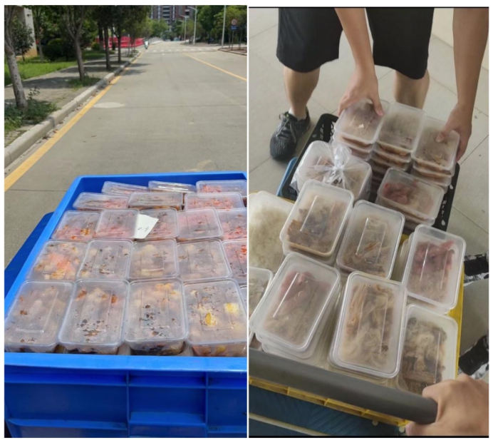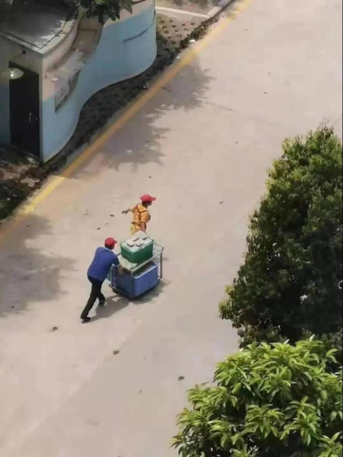 工作人员顶着烈日一轮又一轮地为师生送餐(谢谢你们!)