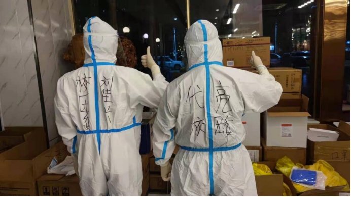 此时,一个个穿着防护服志愿者的身影,成了最令人心安的风景线。为了保障重点宿舍楼内学生的用餐,校团委书记代亮、实践部教师刘佳兴带头上岗,穿上厚厚的防护服,为每一间宿舍派送免费餐品,并叮嘱学生做好疫情防控工作。
