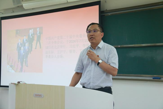10月9日,公共治理学院党总支书记王光辉在东莞校区为师生讲授了主题为“领会党的二十届三中全会精神 做一个有爱有光的青年”的“思政第一课”。教工党员、学生党员参加了学习。活动由公共治理学院党总支副书记刘玉漩主持。