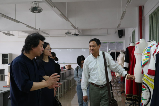 杨贤春副院长(左一)和李怀贵总经理(右一)参观艺术设计学系立体裁剪实验室