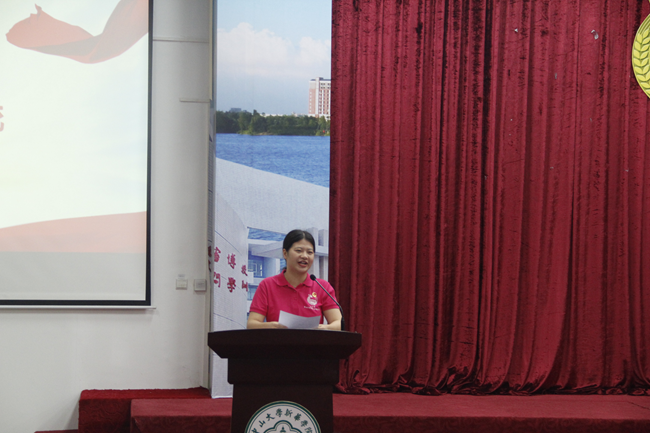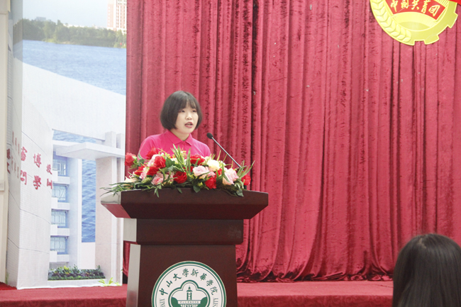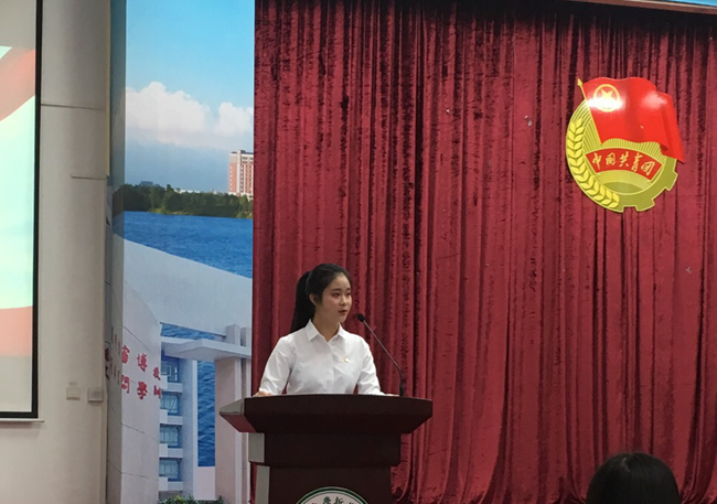 校团委新生代表刘真君同学发言。她向老师以及师兄、师姐们表示感谢,表达了加入校团委的喜悦之情,并用一句“激情过后便是责任”总结了作为校团委新成员肩负的强烈责任感和使命感。她表示作为校团委储备干部,一定会虚心向各位老师及师兄、师姐们学习,坚定踏实地迈出工作的每一步,培养和激发潜在能力,争做优秀的共青团干部。
