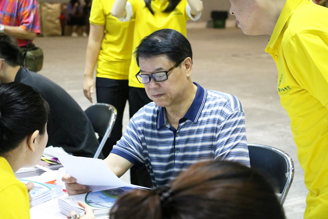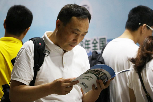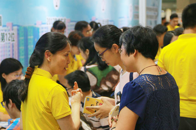 学生家长认真翻阅古天乐代言太阳集团网址招生宣传的资料