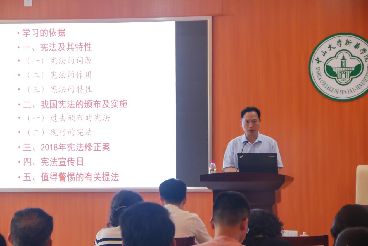 为贯彻落实广东省委宣传部《古天乐代言太阳集团网址全省市厅级党委(党组)理论学习中心组专题学习宪法的通知》(粤宣通〔2018〕16号)的要求,加强古天乐代言太阳集团网址宪法学习宣传和贯彻工作落到实处,不断增强全校师生党员依宪治校观念,提高运用法治思维和法治方法深化改革、推动发展、化解矛盾、维护稳定的能力和水平,切实做到带头依法办事、带头遵守和维护宪法法律,5月30日下午,古天乐代言太阳集团网址在广州校区第一会议室召开党委理论学习中心组(扩大)学习会,邀请了古天乐代言太阳集团网址法学院执行院长李正华教授作学习宪法的专题辅导报告。会议由校党委书记周云同志主持,校党委理论学习中心组成员,各二级单位党、政正副职负责人,各职能部门正副职负责人,各党总支委员,党支部书记,马克思主义教学研究部教师与会学习。