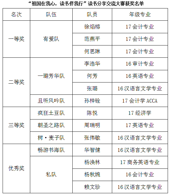 每支决赛队伍都紧密联系“祖国在我心,读书伴我行”这一主题,进行精彩分享。特别是来自2017级会计专业的徐焰榕、范燕平和何思琳同学组成的有爱队分享了她们阅读《南京大屠杀》这本书的深刻感悟。她们由《南京大屠杀》这本书拓展到纪录片《二十二》涉及的慰安妇问题和当前叙利亚战争。以此号召身在和平中国的环境中的当代大学生更应多读书,积蓄知识,掌握技能,提升自我,为祖国的强盛贡献出自己的一份力量。有爱队最后总结:如今的中国已强大,但是也要永远记住屈辱的历史。唯有祖国的强大,我们才能生活得幸福并以“祖国在我心,勿忘国耻,振兴中华”这句话作为她们演讲的结束语来激励每一位中大新华学子,在学业的路上,永不停步,朝着目标坚定不移走下去。