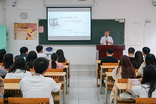 王庭槐还结合时事热点和当代青年特点,重点阐释了社会主义核心价值观和我们当代大学生的密切关系。他强调,经济的迅猛发展促进了社会的快速发展与变革,同学们则要及时抓住新时代所带来的机遇与挑战,充分认识自我的优势和劣势,完善并更新自我的知识体系,在“知育、情育、意育”中锤炼人格,学会求知,学会做人,在大学四年打好根基,努力成长为新时代中国特色社会主义事业的建设者和接班人。