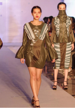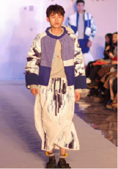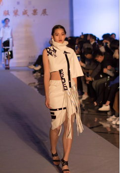 本次成果展展出了艺术设计学系2015级学生27个系列服装设计作品,由指导老师张长敏结合《创意服装设计》课程指导完成。同学们根据采风所得的灵感,经由创意思考进行设计方案构思与绘制,确立设计方案后开始进行纸样设计,用白坯布制作头版样衣试样审板,根据老师给出的修改意见进行板型修正,确定板型后用合适的面料缝制完成。在服装设计中,有些系列还需要另外开发面料,自行设计印制面料花型、装饰细节,提升制作工艺等。每一件作品都凝聚了同学们的心血,参与设计服装的同学接受采访时说:“看到自己作品呈现在T台上,是一种鼓励,也是一种肯定。”