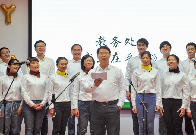 教务处合唱《我只在乎你》,歌曲的最后,李中生副校长改编歌词唱道:“任时光流去我只在乎你,情愿感染新华的气息,人生几何能够工作在一起,失去生命的力量也不可惜!”表达出自己对新华浓浓的爱。
