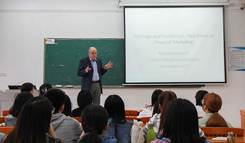 11月7日,中山大学新华学院(以下简称学校)经济与贸易学院再次邀请世界著名经济学家、伦敦政治经济学院金融学教授、学校经济与贸易学院金融工程专业首席教授、投资学专业学科带头人Prof.Ron Anderson莅临东莞校区为15级金融工程专业的本科生讲授“套利与均衡:财政模型的两大支柱”。此次Prof.Ron Anderson走进一线课堂为学生授课,旨在提升学生进行探索性学习和批判性学习的能力,进一步开拓学生视野、培养国际化人才。